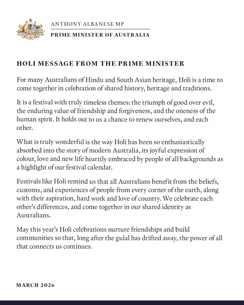 ലോകത്തിന്റെ നാനാഭാഗത്തുനിന്നുള്ള ആളുകളുടെ വിശ്വാസങ്ങളിൽ നിന്നും ആചാരങ്ങളിൽ നിന്നും അനുഭവങ്ങളിൽ നിന്നും എല്ലാ ഓസ്ട്രേലിയക്കാർക്കും പ്രയോജനം ലഭിക്കുന്നുണ്ടെന്ന് ഹോളി പോലുള്ള ഉത്സവങ്ങൾ നമ്മെ ഓർമ്മിപ്പിക്കുന്നുവെന്നും അദ്ദേഹം വ്യക്തമാക്കി. എല്ലാവരുടെയും കഠിനാധ്വാനവും രാജ്യസ്നേഹവും ഇതിൽ ഉൾപ്പെടുന്നു. നാം പരസ്പരമുള്ള വ്യത്യാസങ്ങളെ ആഘോഷിക്കുകയും, ഓസ്ട്രേലിയക്കാർ എന്ന നിലയിലുള്ള നമ്മുടെ പൊതുസ്വത്വത്തിൽ ഒന്നിക്കുകയും ചെയ്യുന്നു.